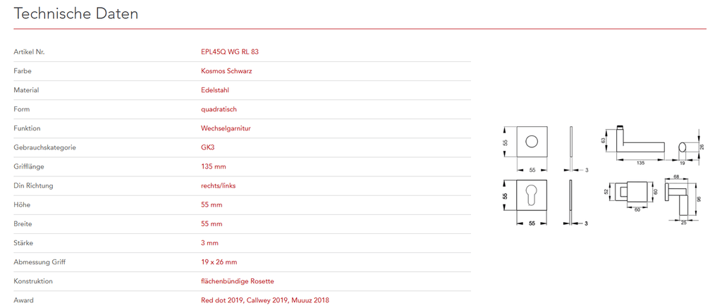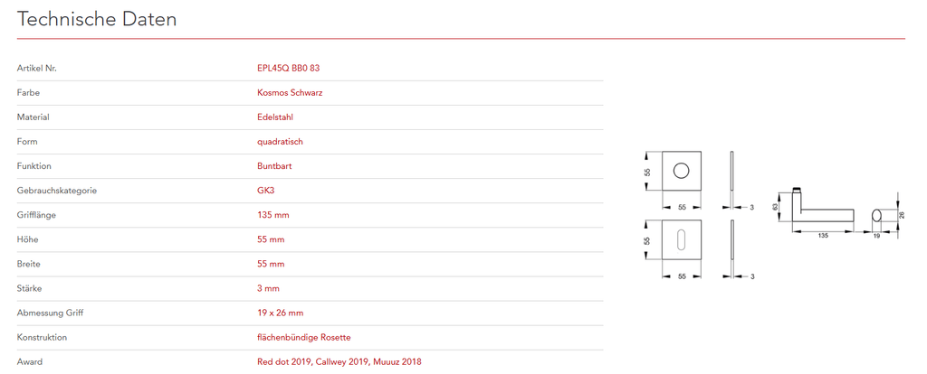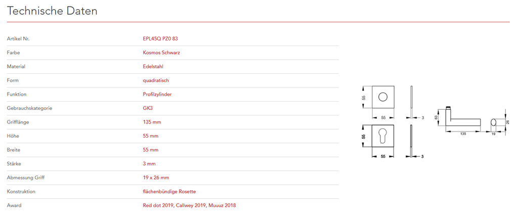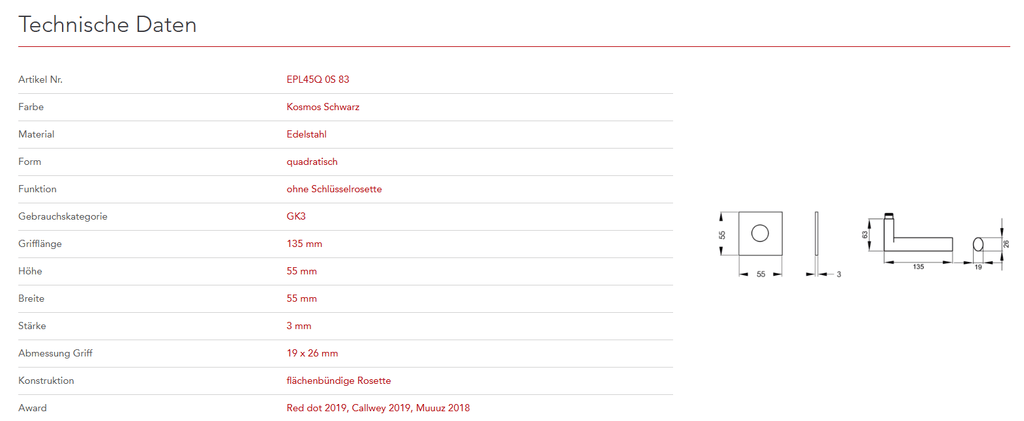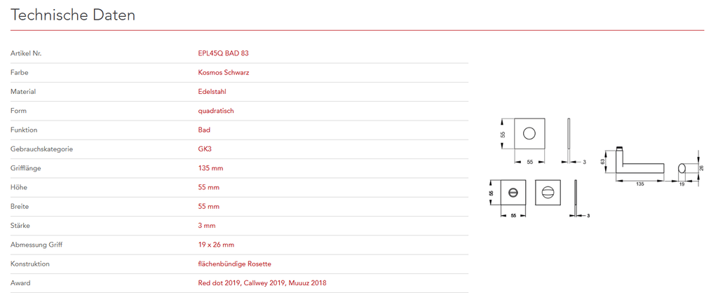 Das Designkonzept des Modells Madeira EPL45Q liegt in der Zusammenführung von quadratischen und ovalen Elementen. Gradlinige und schlichte Formen charakterisieren dieses Modell. In Kombination mit der 3 mm dünnen Plan Design Rosette, werden fließende Übergänge und Ästhetik vereint. Die mehrfach prämierte seidenweiche Oberfläche Kosmos Schwarz, schafft eine unvergessliche Haptik.