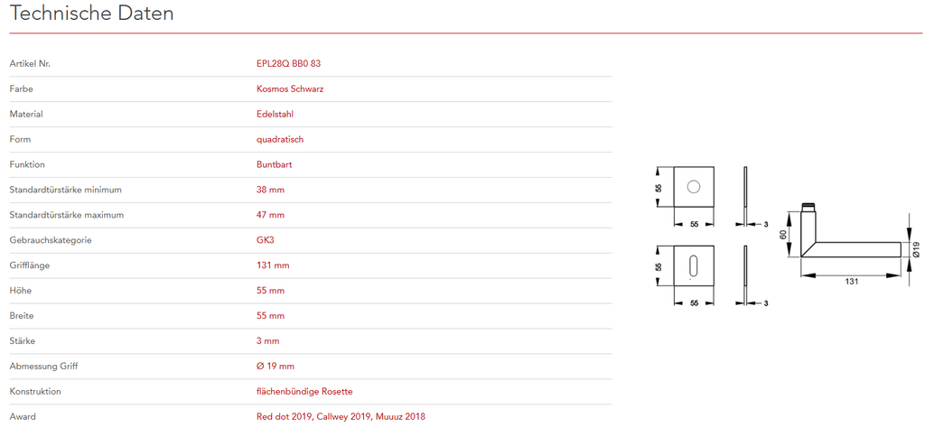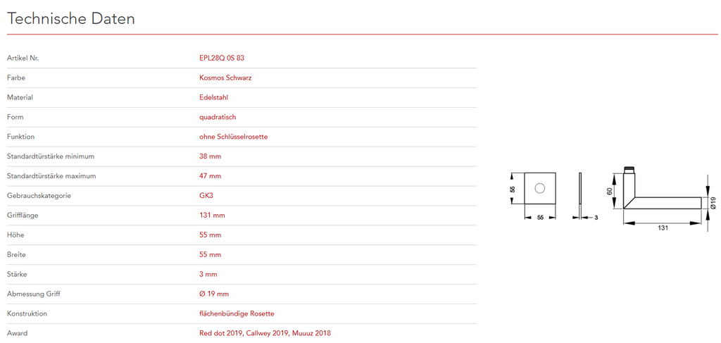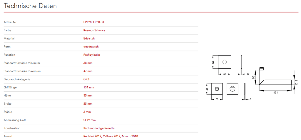 Das Modell Rhodos EPL28Q ist der Klassiker schlechthin. Durch seine Geometrische Form, ist das Modell der Bestseller unter den Türgriffen. In Kombination mit der 3 mm dünnen Plan Design Rosette, werden fließende Übergänge und Ästhetik vereint. Die mehrfach prämierte seidenweiche Oberfläche Kosmos Schwarz, schafft eine unvergessliche Haptik.