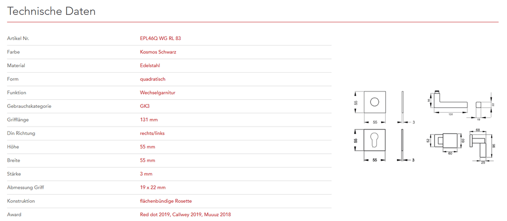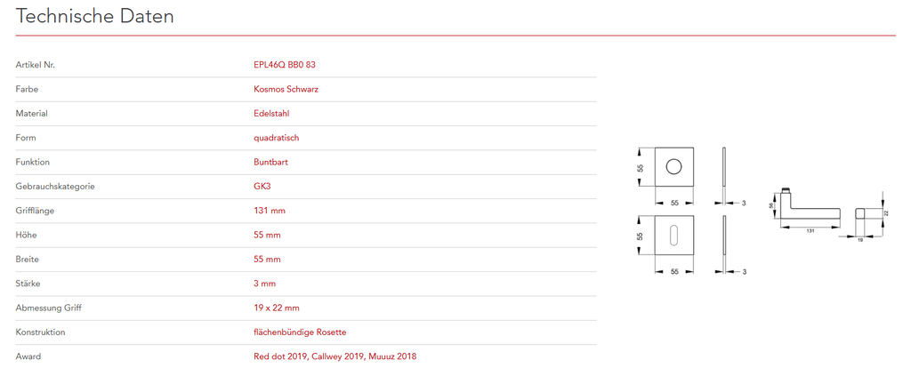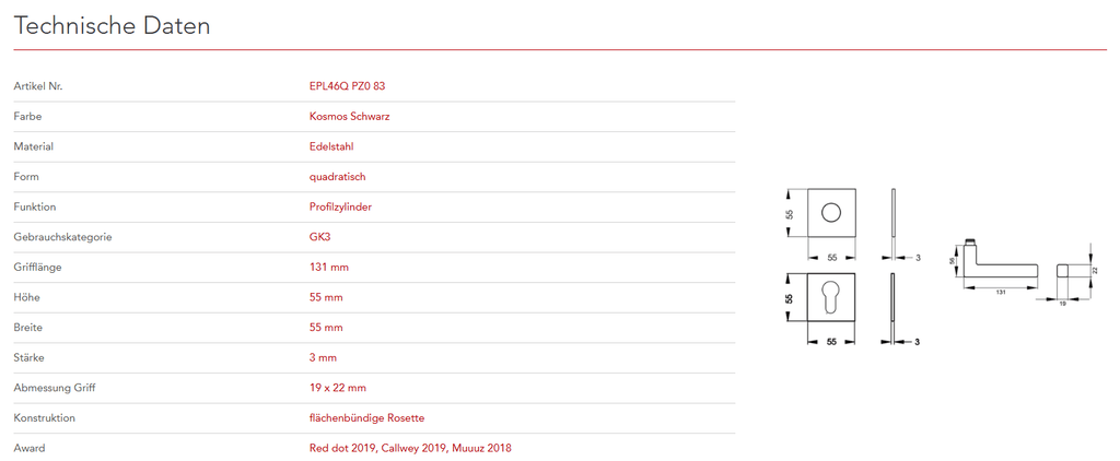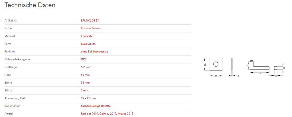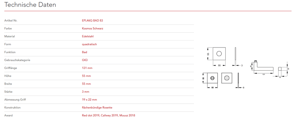 Quadratisch, schlicht und geradlinig ist das Designkonzept des Models EPL46Q. Rational und minimalistisch folgt dieser Griff dem Trend zu geraden Linien. In Kombination mit der 3 mm dünnen Plan Design Rosette, werden fließende Übergänge und Ästhetik vereint. Die mehrfach prämierte seidenweiche Oberfläche Kosmos Schwarz, schafft eine unvergessliche Haptik.