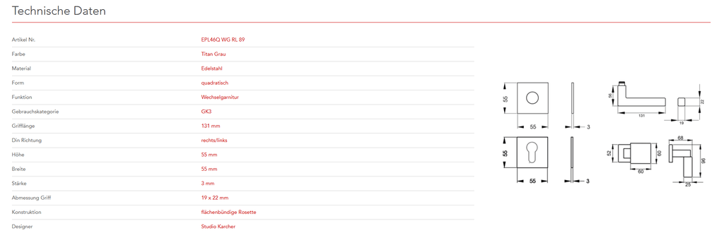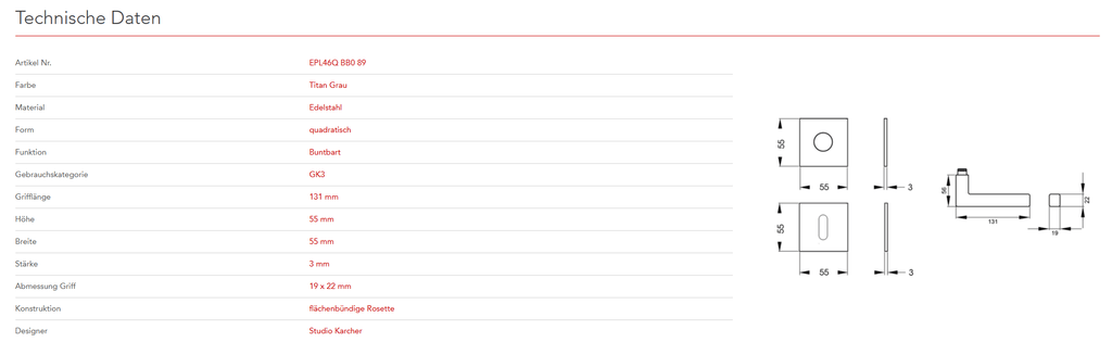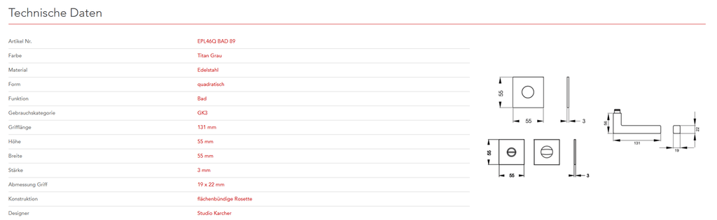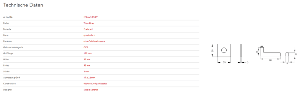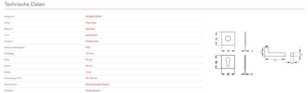 Quadratisch, schlicht und geradlinig ist das Designkonzept des Models EPL46Q. Rational und minimalistisch folgt dieser Griff dem Trend zu geraden Linien. In Kombination mit der 3mm dünnen Plan Design Rosette, ist eine aufgesetzte oder flächenbündige Montage möglich. Die Farbe Titan Grau überzeugt durch seine matte Oberfläche und warm-graue Farbigkeit.