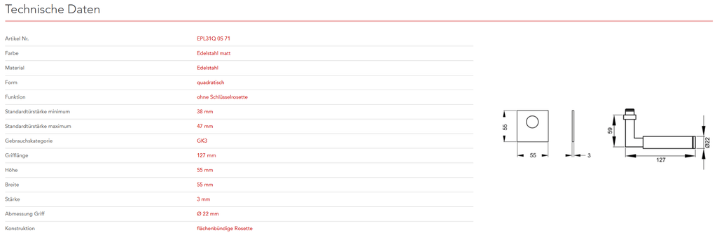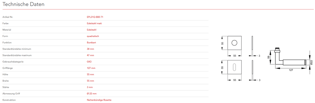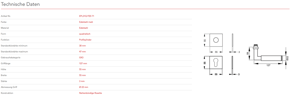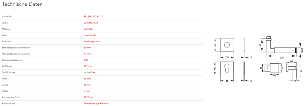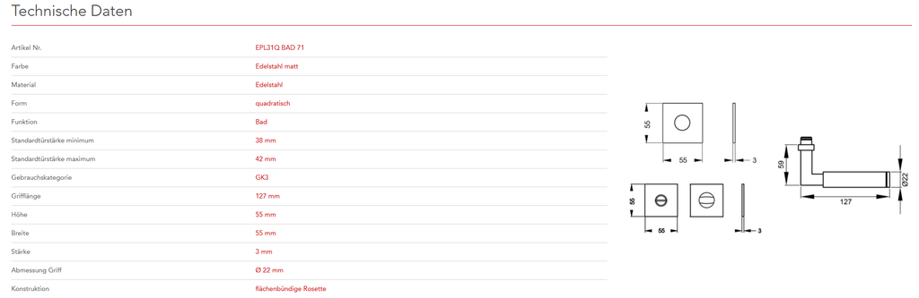 mit Plan Design Rosette EZ180Q ohne Hochhaltefeder - QUADRATISCH