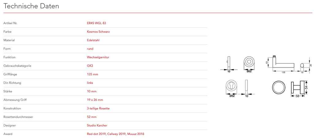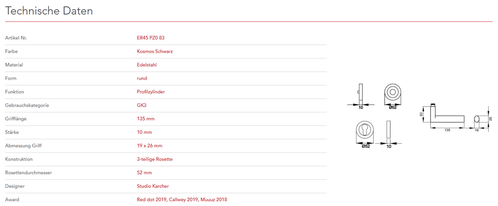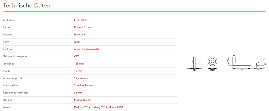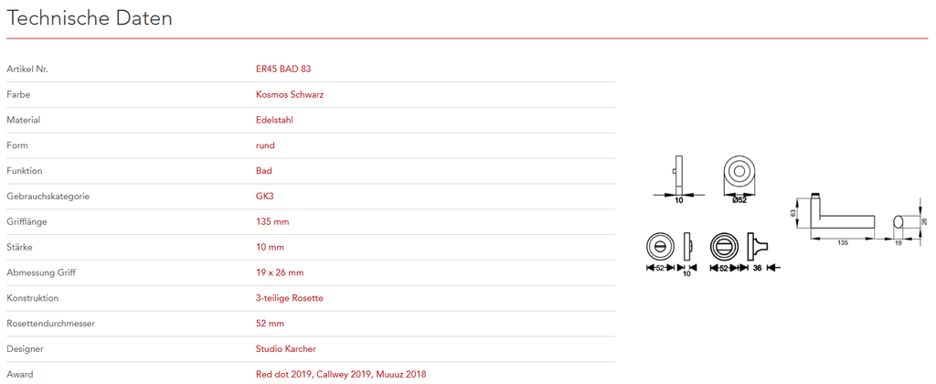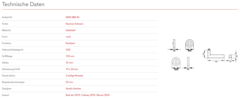 "Tolle Produkte mit besonderen Designs. Mal was anderes als Standard. Auch gibt´s hier trendige Oberflächen wie z.B Titangrau, passt gut zu weißen oder auch holzfarbigen Türen. Sehr leicht zu montieren auf Grund der dreiteiligen Rosettentechnik. Grundrosette anschrauben, Griff mit fest/drehbarer Rosette aufschieben, Überschraubring draufschrauben. Schrauben andrehen. Bombenfest.
