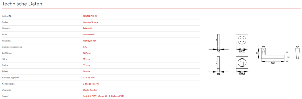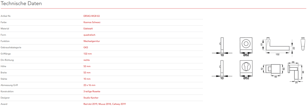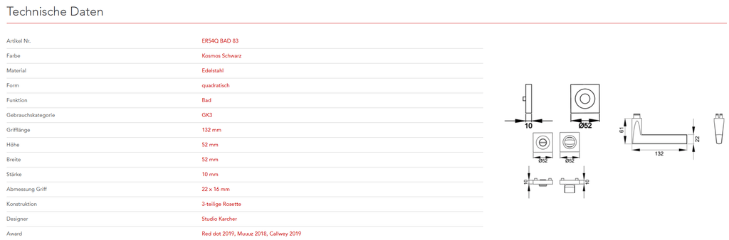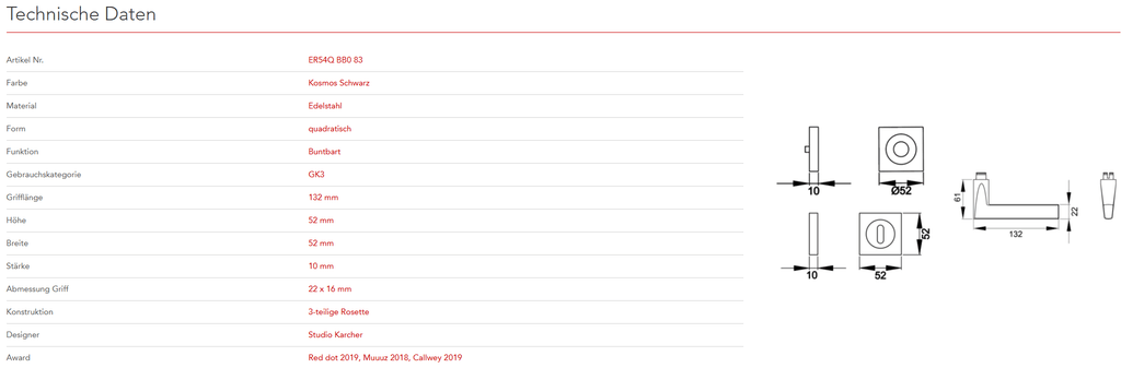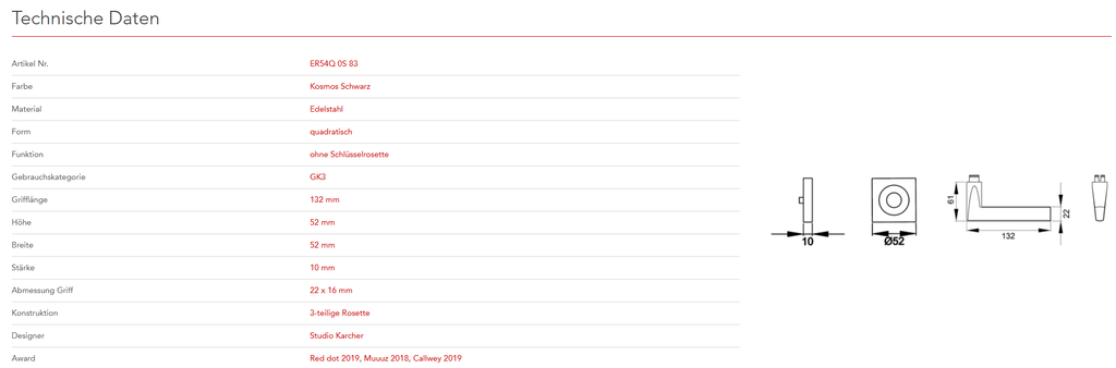 Hochwertiger Edelstahl und eine vollkommene Formsprache verleihen dem Türgriff Montana ER54Q eine hervorragende Handhabe. Die Reduktion auf geometrische Formen lassen den Türgriff elegant und zeitlos wirken. Durch die 3-teilige Schraubrosette, wird eine einfache, schnelle und sichere Montage gewährleistet. Die mehrfach prämierte seidenweiche Oberfläche Kosmos Schwarz, schafft eine unvergessliche Haptik.