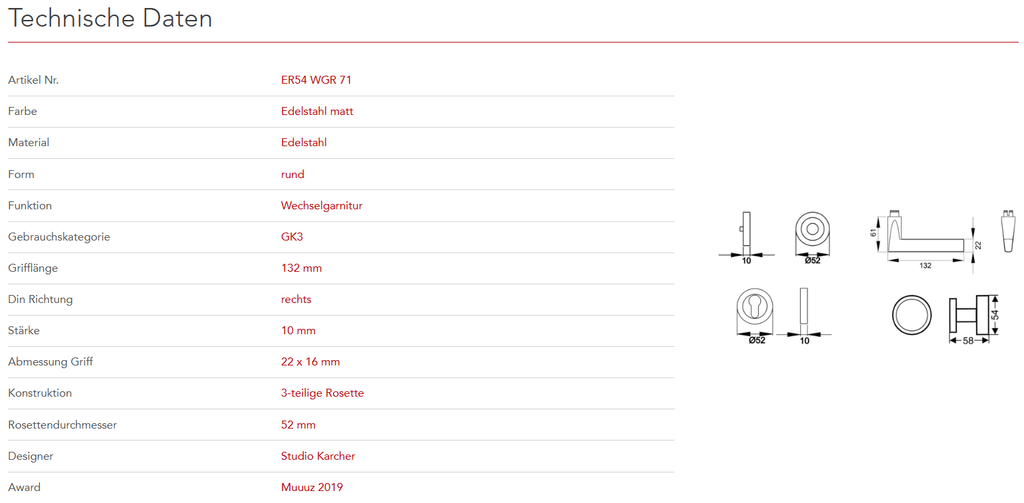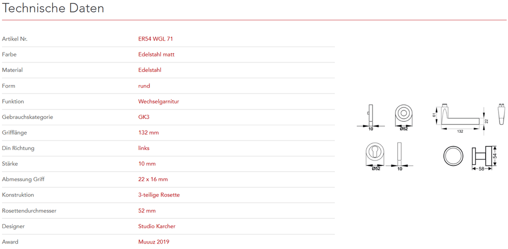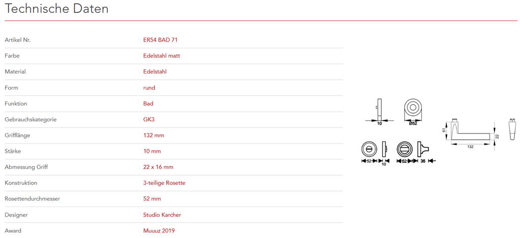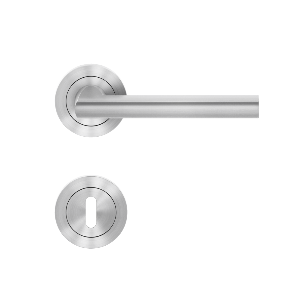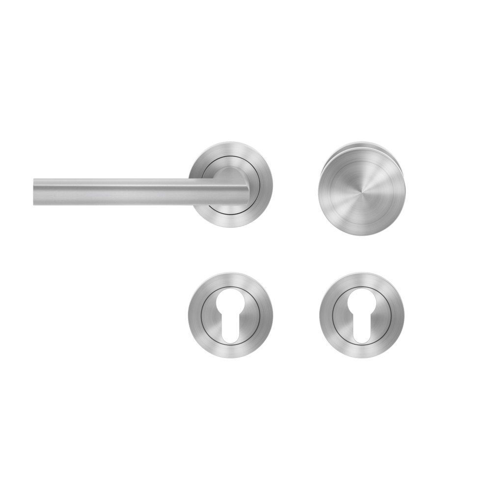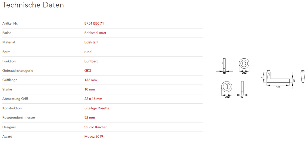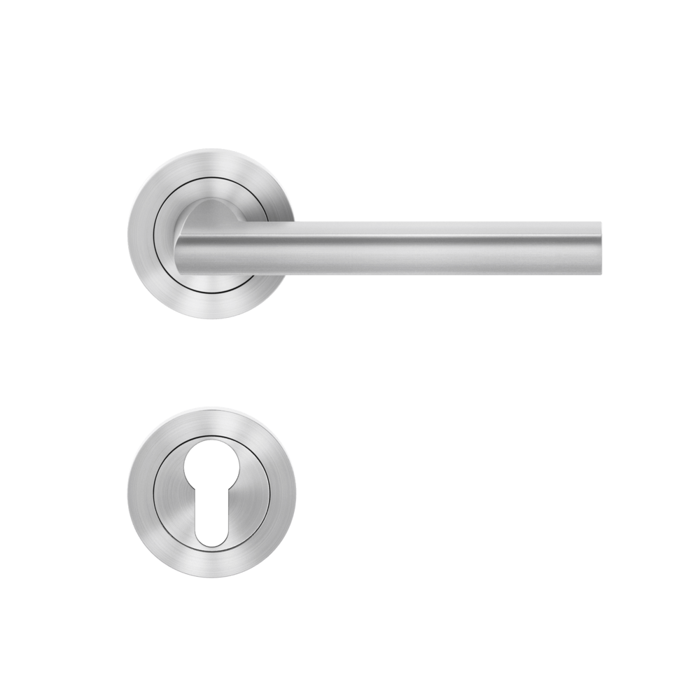 Hochwertiger Edelstahl und eine vollkommene Formsprache verleihen dem Türgriff Montana ER54 eine hervorragende Handhabe. Die Reduktion auf geometrische Formen lassen den Türgriff elegant und zeitlos wirken. Durch die 3-teilige Schraubrosette, wird eine einfache, schnelle und sichere Montage gewährleistet. Die edelstahlmatte Farbe unterstreicht die Formgebung dieses Griffs.