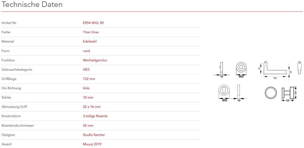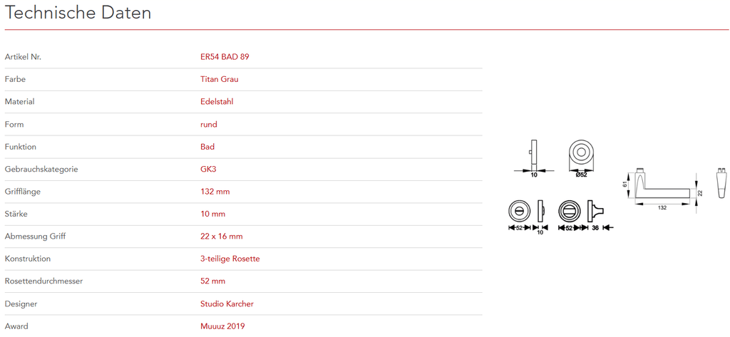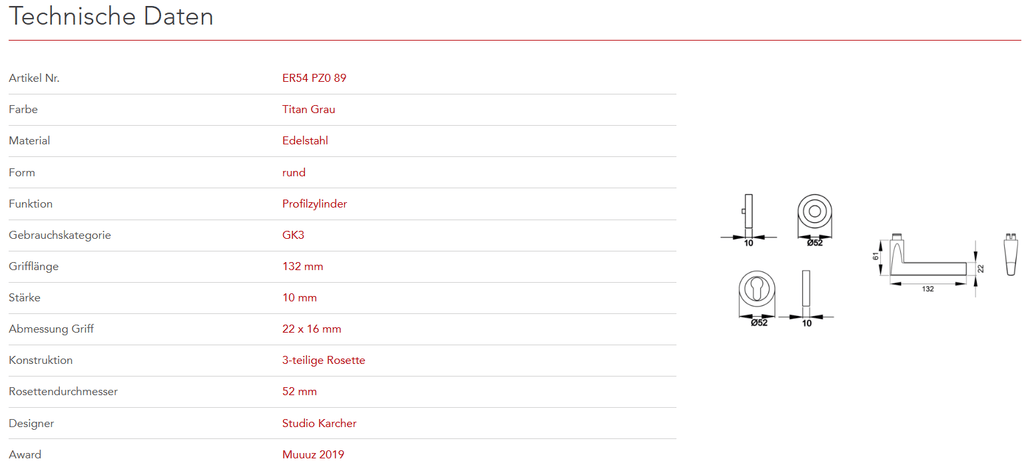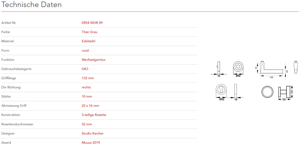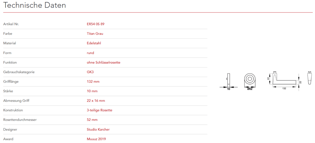 Hochwertiger Edelstahl und eine vollkommene Formsprache verleihen dem Türgriff Montana ER54 eine hervorragende Handhabe. Die Reduktion auf geometrische Formen lassen den Türgriff elegant und zeitlos wirken. Durch die 3-teilige Schraubrosette, wird eine einfache, schnelle und sichere Montage gewährleistet. Die Farbe Titan Grau überzeugt durch seine matte Oberfläche und warm-graue Farbigkeit.