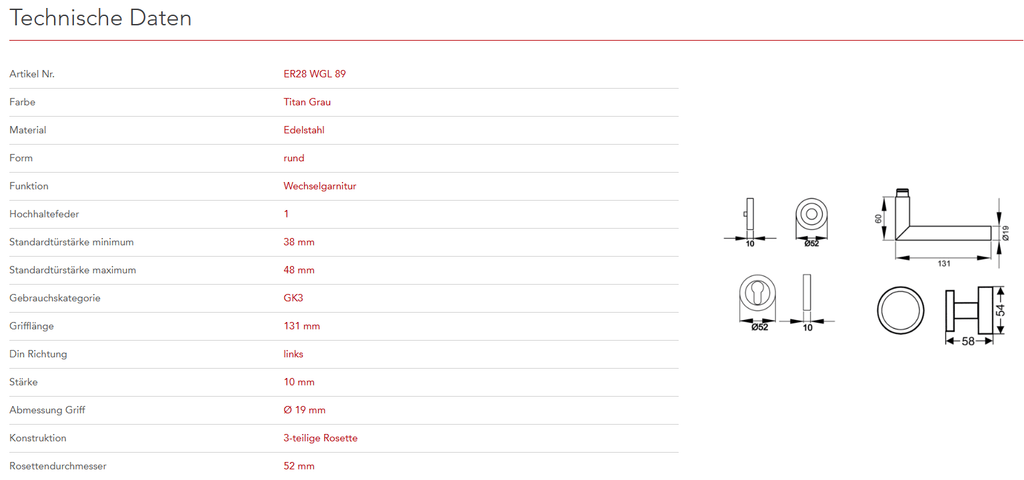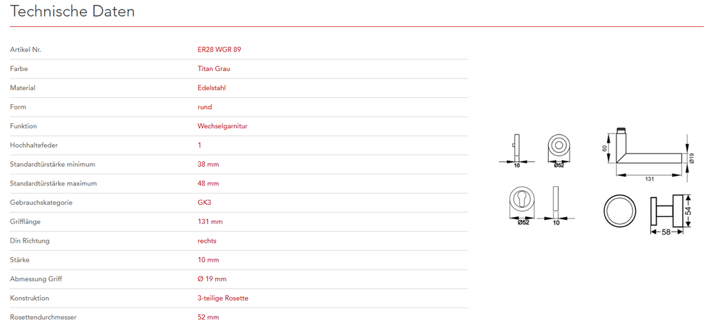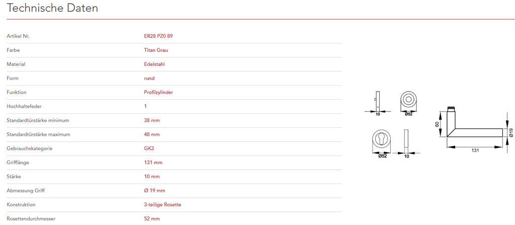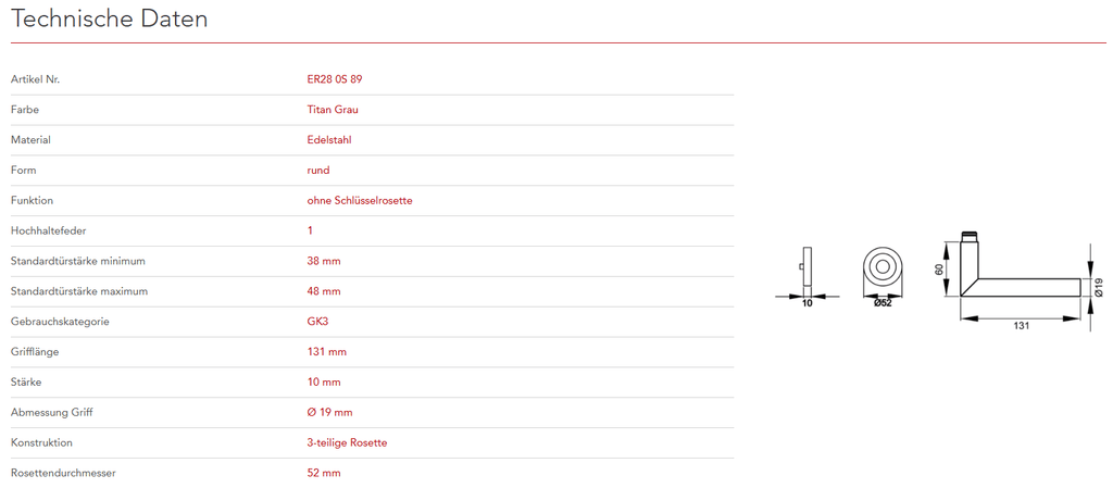 Das Modell Rhodos ER28 ist der Klassiker schlechthin. Durch seine Geometrische Form, ist das Modell der Bestseller unter den Türgriffen. Durch die 3-teilige Schraubrosette, wird eine einfache, schnelle und sichere Montage gewährleistet. Die Farbe Titan Grau überzeugt durch seine matte Oberfläche und warm-graue Farbigkeit.
