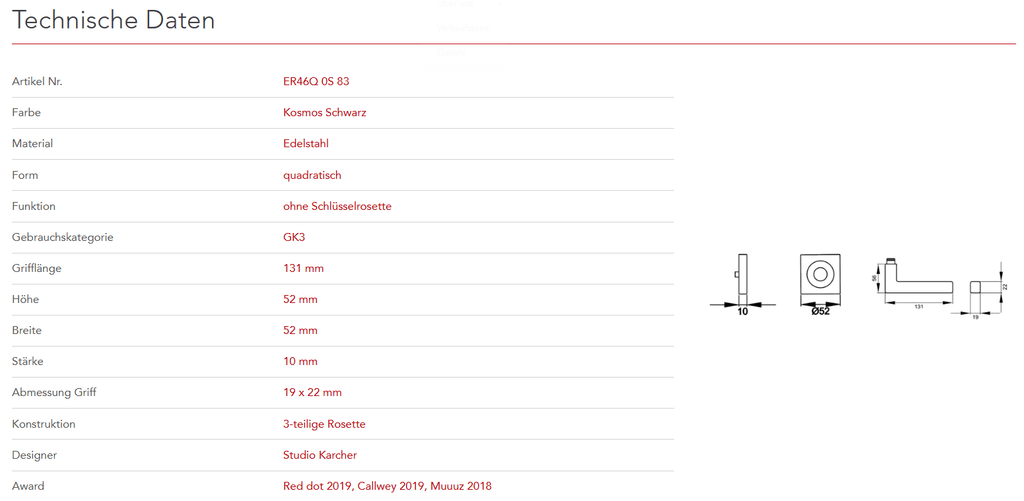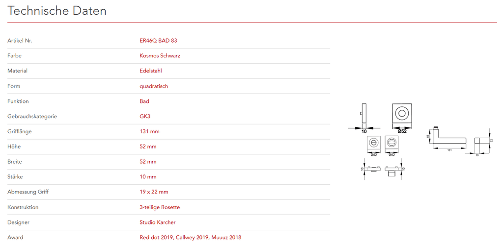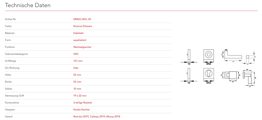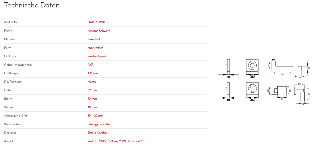 Quadratisch, schlicht und geradlinig ist das Designkonzept des Models ER46Q. Rational und minimalistisch folgt dieser Griff dem Trend zu geraden Linien. Durch die 3-teilige Schraubrosette, wird eine einfache, schnelle und sichere Montage gewährleistet. Die mehrfach prämierte seidenweiche Oberfläche Kosmos Schwarz, schafft eine unvergessliche Haptik.