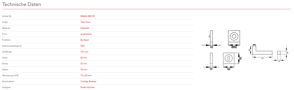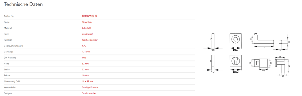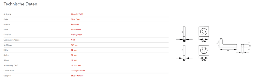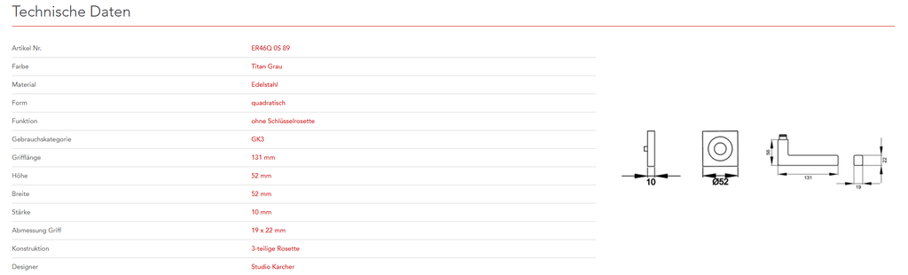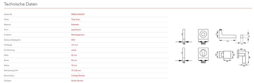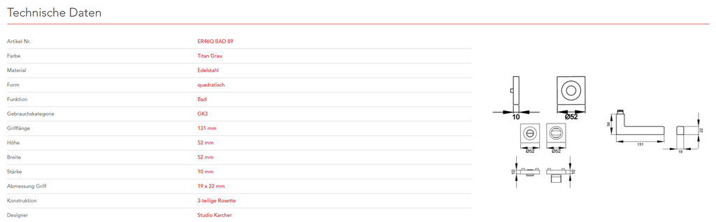 Quadratisch, schlicht und geradlinig ist das Designkonzept des Models ER46Q. Rational und minimalistisch folgt dieser Griff dem Trend zu geraden Linien. Durch die 3-teilige Schraubrosette, wird eine einfache, schnelle und sichere Montage gewährleistet. Die Farbe Titan Grau überzeugt durch seine matte Oberfläche und warm-graue Farbigkeit.