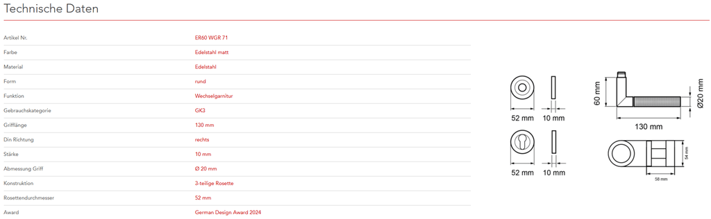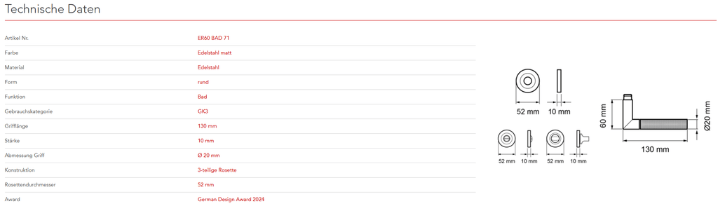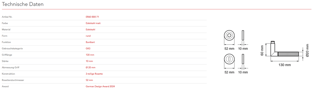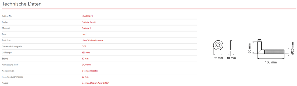 Das Modell ER60 Studio One ist eine neue Variante des Top-Produkts Rhodos. Die neue und stylische Diamond Touch-Oberfläche, verleiht dem schlichten Griff eine besondere und einzigartige Note. Durch die 3-teilige Rosettentechnik, wird eine einfache, schnelle und sichere Montage gewährleistet. Die edelstahlmatte Farbe unterstreicht die Formgebung dieses Griffs.