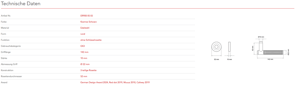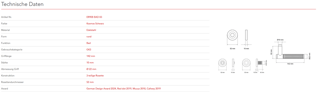 Das Modell ER90 der Studio Serie bietet durch seine einzigartige Kombination der Elemente und die Diamond-Touch Oberfläche ästhetische Akzente. Durch die 3-teilige Rosettentechnik wird eine einfache, schnelle und sichere Montage gewährleistet. Die mehrfach prämierte seidenweiche Oberfläche Kosmos Schwarz schafft eine unvergessliche Haptik.