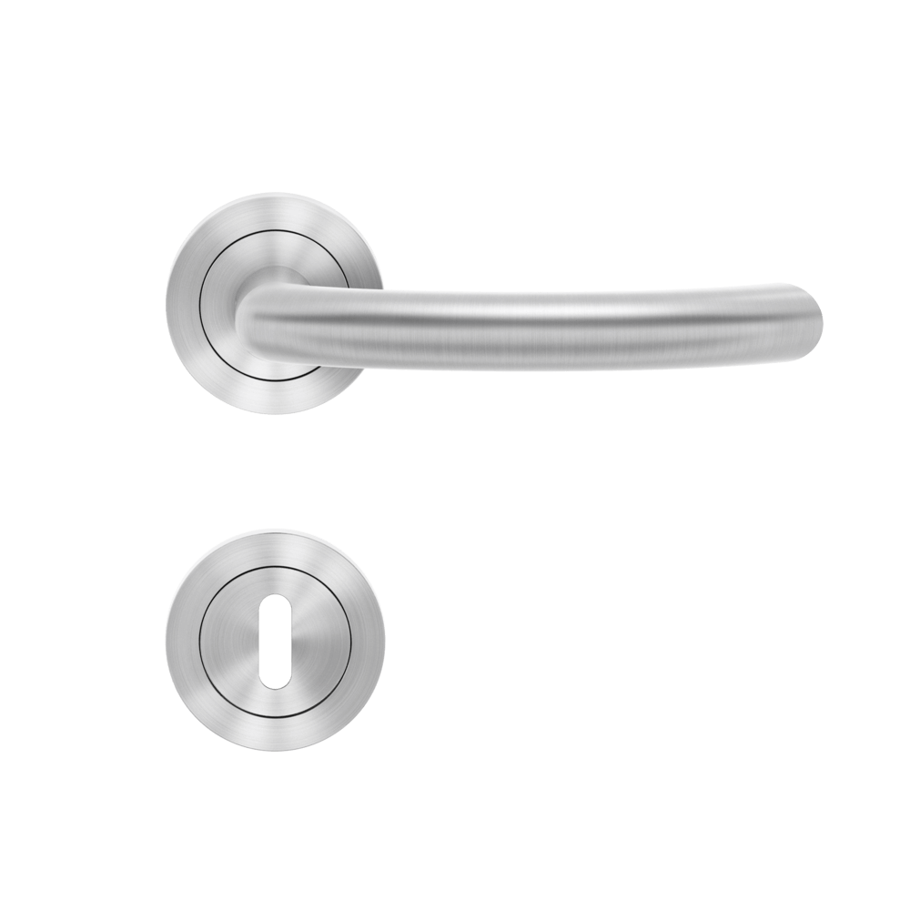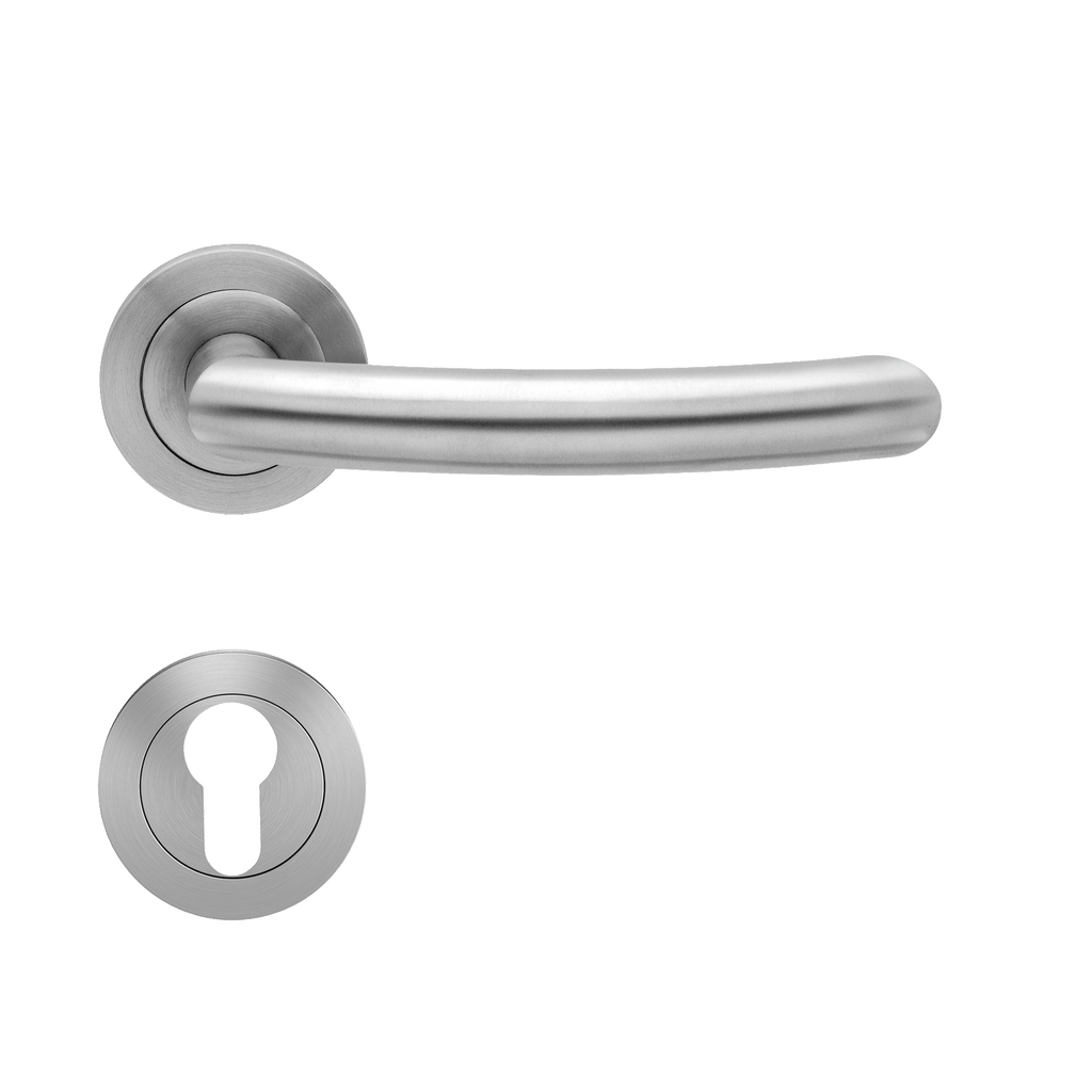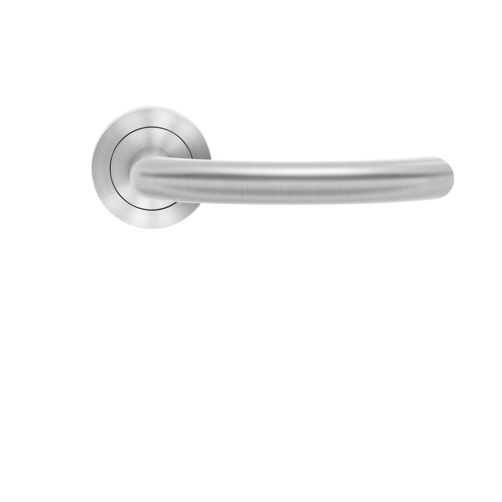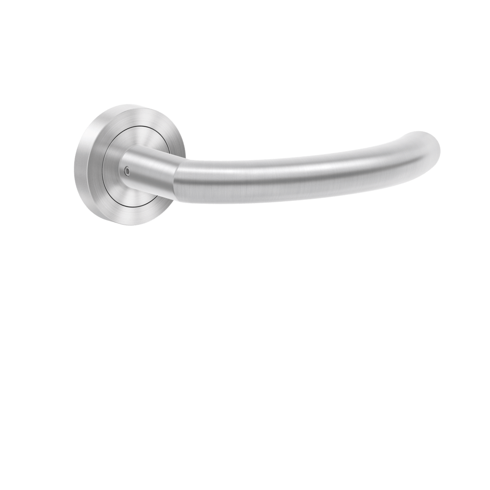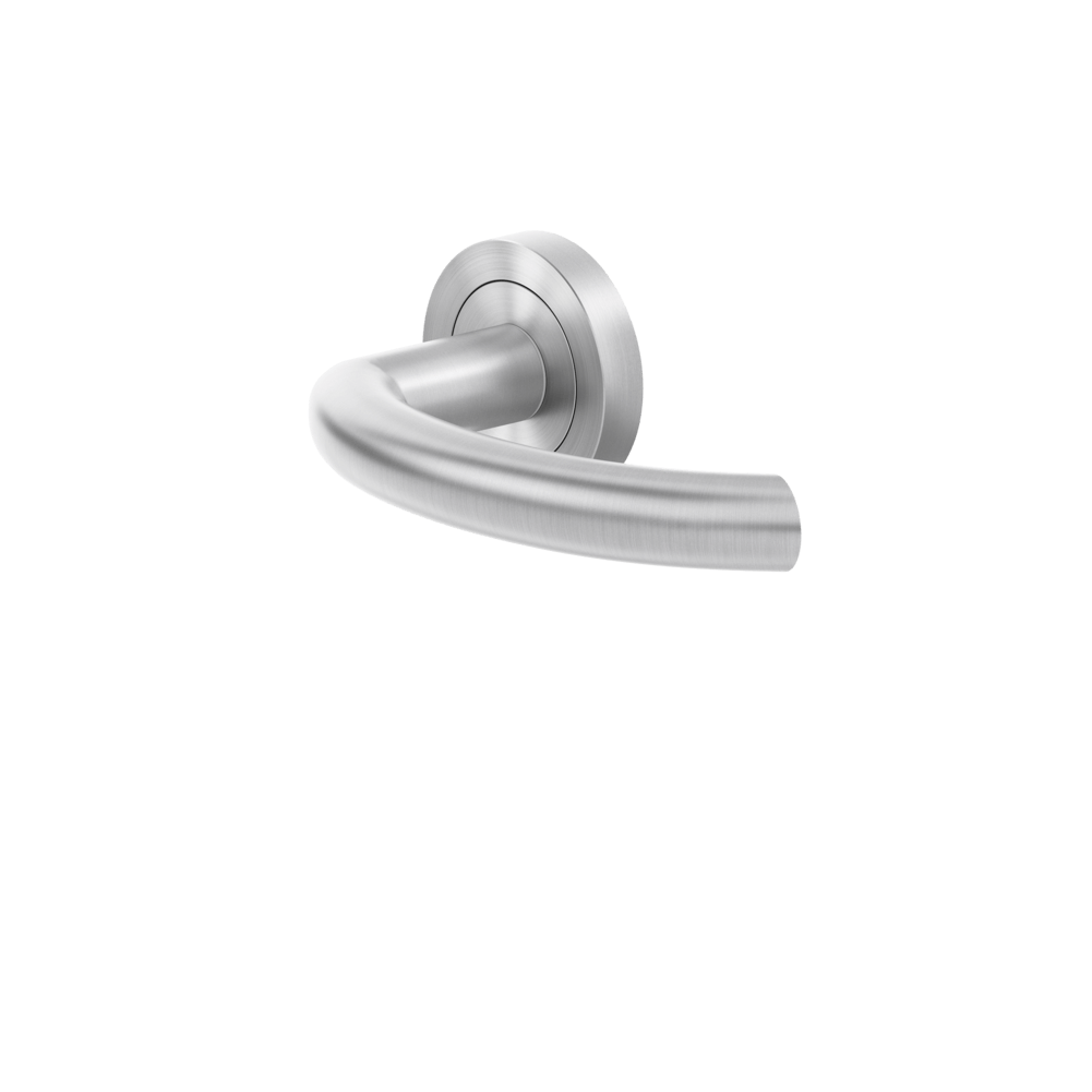 Der Türgriff Sylt ER26 biegt sich elegant der Hand entgegen. Durch sein abgeschrägtes Ende wirkt er dabei schlicht und fügt sich der Tür. Durch die 3-teilige Schraubrosette, wird eine einfache, schnelle und sichere Montage gewährleistet. Die edelstahlmatte Farbe unterstreicht die Formgebung dieses Griffs.