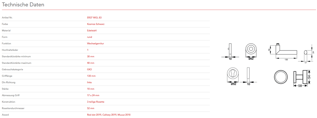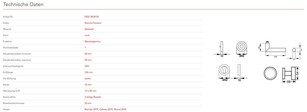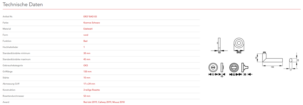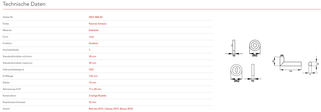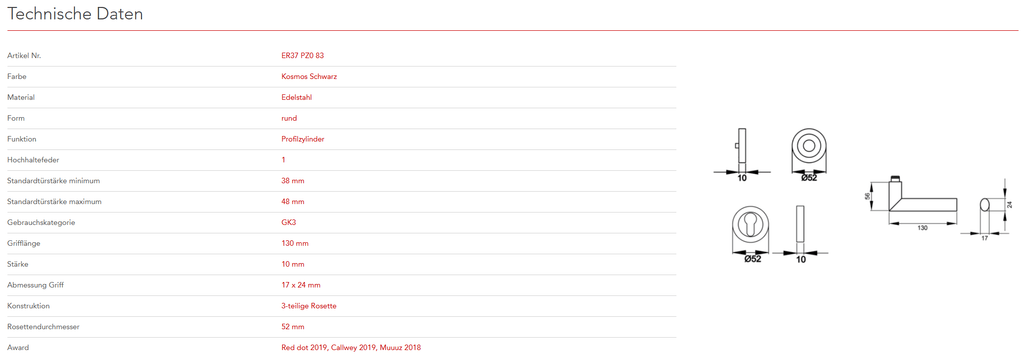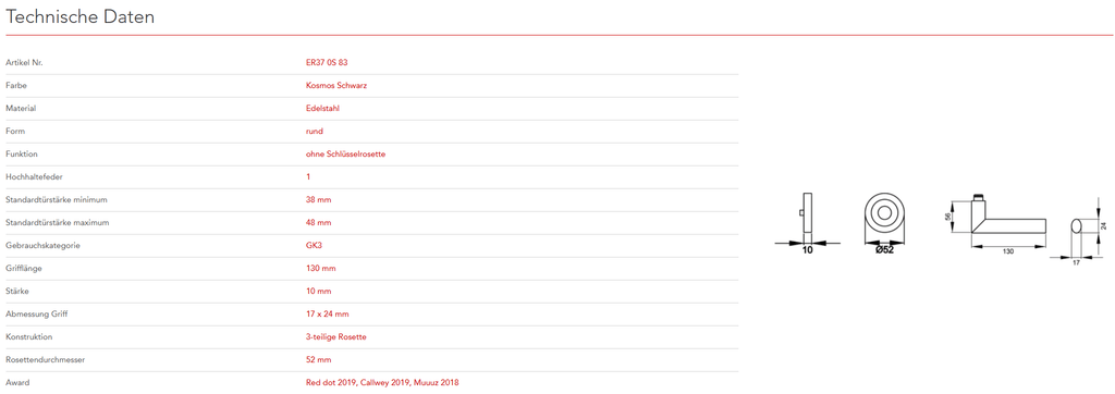 Der Türgriff Verona ER37 zeichnet sich durch sanftere und fließende Konturen aus, was durch den ovalen Hals unterstützt wird. Durch die 3-teilige Schraubrosette, wird eine einfache, schnelle und sichere Montage gewährleistet. Die mehrfach prämierte seidenweiche Oberfläche Kosmos Schwarz, schafft eine unvergessliche Haptik.