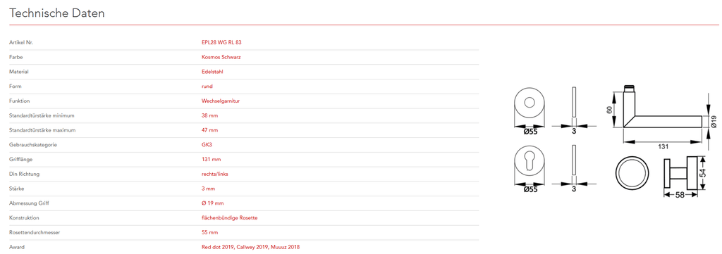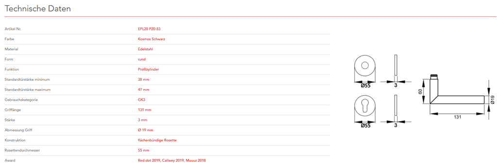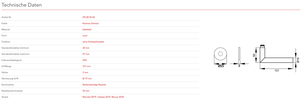 Das Modell Rhodos EPL28 ist der Klassiker schlechthin. Durch seine Geometrische Form, ist das Modell der Bestseller unter den Türgriffen. In Kombination mit der 3mm dünnen Plan Design Rosette, ist eine aufgesetzte oder flächenbündige Montage möglich. Die mehrfach prämierte seidenweiche Oberfläche Kosmos Schwarz, schafft eine unvergessliche Haptik.